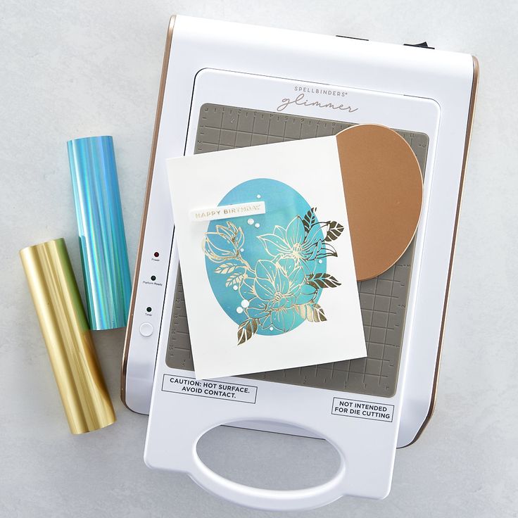 To Glimmer system της Spellbinders, αξιοποιεί τις μηχανές die-cutting που διαθέτουν οι περισσότεροι crafters. Το πρώτο στάδιο- αυτό της θέρμανσης του die- γίνεται πάνω στην πλατφόρμα Glimmer. Στη συνέχεια φτιάνουμε το "σάντουιτς" που περνάει από την μηχανή κοπής μας, η οποία ασκεί την απαραίτητη πίεση που χρειάζεται για την μεταφορά του foil πάνω στο χαρτί.