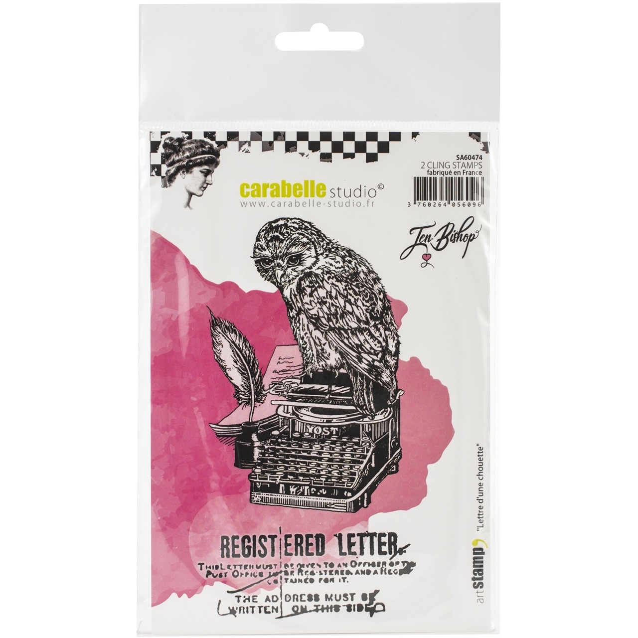 Το σετ Lettre d'une Chouette που έχει σχεδιάσει η Jen Bishop για την Carabelle Studio απεικονίζει μια κουκουβάγια που κάθεται σε μία vintage γραφομηχανή και το sentiment "Registered letter".