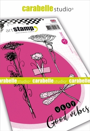 Σετ που αποτελείται από 4 σφραγίδες rubber σε cling με λουλούδια, μια λιβελούλα και το sentiment "Very good vibes".