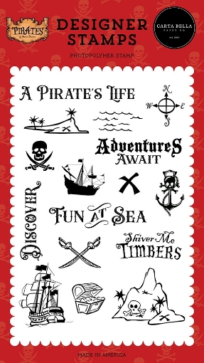 👉 Η συσκευασία περιλαμβάνει 16 διάφανες σφραγίδες με εικόνες με νεκροκεφαλές, πειρατικές σημαίες, σεντούκια, πειρατικά καράβια και sentiments όπως Adventure Awaits, Treasure, Fun At Sea και άλλα.