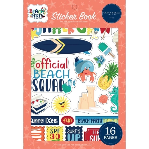 Μπλοκ αυτοκόλλητων από τη συλλογή Beach Party που έχει σχεδιάσει ο Steven Duncan για την Carta Bella. 16 φύλλα με cardstock αυτοκόλλητα (2 από το καθένα). Εικόνες με κάστρα στην άμμο, ιππόκαμπους, ήλιος, ψυγειάκια με πάγο, ξαπλώστρες, ομπρέλες θαλάσσης, καρχαρίες, χταπόδια και άλλα πολλά.