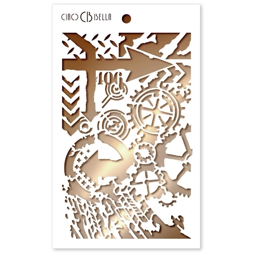 👉 Η συσκευασία περιέχει ένα στένσιλ με μια σύνθεση από γρανάζια, βέλη, τόξα, τον αριθμό 406 και άλλα.