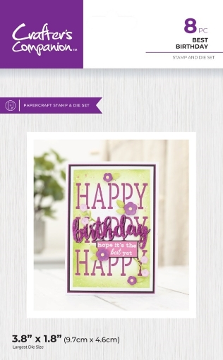 Σετ με μήτρες κοπής και διάφανη σφραγίδα από την Crafter's Companion. Το σετ περιέχει 7 μεταλλικές μήτρες κοπής με την ευχή Happy Birthday, λουλούδια και άλλα διακοσμητικά. Το final touch στο μήνυμά σας δίνει η διάφανη σφραγίδα με το sentiment "hope it's the best yet"!
