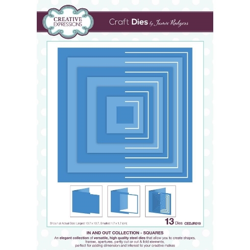 Η συλλογή In And Out Collection Dies που έχει σχεδιάσει ο Jamie Rodgers για την Creative Expressions είναι ιδανική για να δημιουργήσετε σχήματα, πλαίσια, ανοίγματα, να κόψετε μερικώς ή να κόψετε και να διπλώσετε elements ακόμα και να δώσετε διάσταση στα έργα σας! Χρησιμοποιήστε τες όλες μαζί ή κάποιες μαζί, ή μία-μία. Οι επιλογές είναι ανεξάντλητες! Επιστρατεύστε τη φαντασία σας και καλές δημιουργίες!