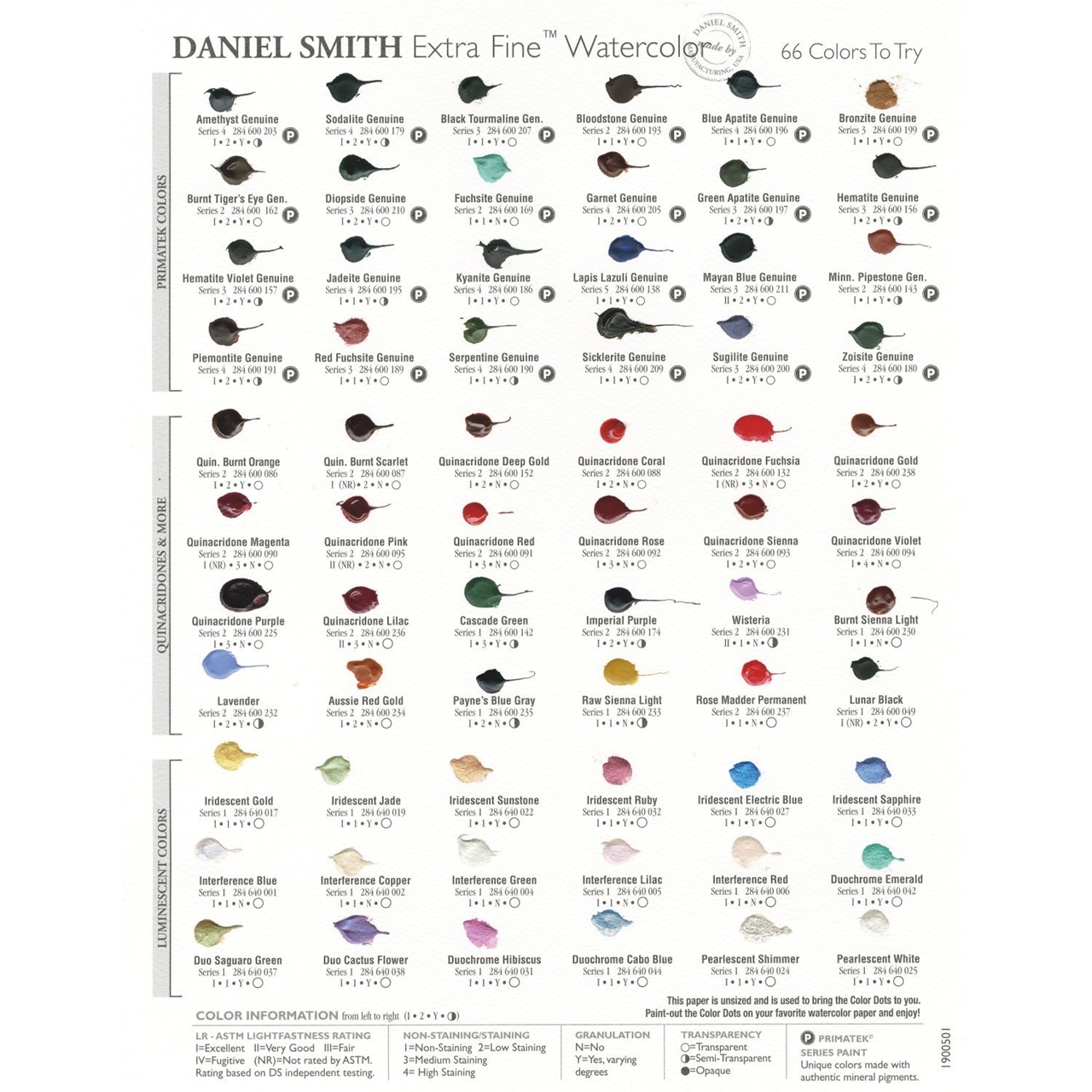 Τα Daniel Smith θεωρούνται τα καλύτερα χρώματα ακουαρέλας στον κόσμο. Φτιάχνονται στο χέρι στην Αμερική από το 1993 και είναι πασίγνωστα λόγω των μοναδικών extra fine χρωστικών τους, που δημιουργούν χρώματα με μεγάλη ένταση αλλά και εξαιρετική σταθερότητα και αντοχή στο χρόνο. Είναι η επιλογή του επαγγελματία ακουαρελίστα αλλά και του ερασιτέχνη που θέλει το καλύτερο υλικό για τις δημιουργίες του!