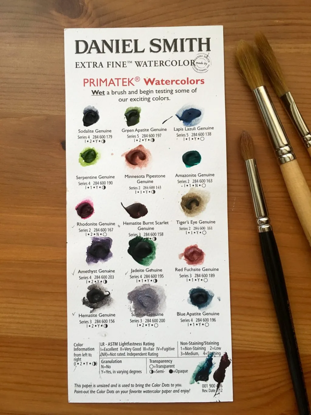 Τα PrimaTek της Daniel Smith είναι χρώματα ακουαρέλας που κατασκευάζονται από ορυκτά. Οι περισσότερες χρωστικές που προέρχονται από ορυκτά δίνουν μοναδικά εφέ κόκκου (granulation), που δεν θα βρείτε σε άλλου τύπου χρωστικές. Αναμιγνύονται πανέμορφα με τα άλλα χρώματα της παλέτας σας, δημιουργώντας μοναδικά νέα χρώματα που θα δώσουν μια διαφορετική όψη στο έργο σας. Είναι βαρύτερα από τις άλλες χρωστικές, οπότε εισχωρούν στο χαρτί δημιουργώντας μοναδικές υφές.