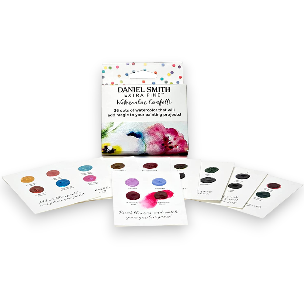 Το Confetti Dot Card Set είναι σχεδιασμένο ως μια παιχνιδιάρικη αλλά ουσιαστική εισαγωγή στον κόσμο των χρωμάτων Daniel Smith. Περιλαμβάνει 36 διαφορετικά χρώματα, χωρισμένα σε 9 θεματικές κάρτες, καθεμία με το δικό της χρωματικό concept: από ορυκτά pigments και granulation, μέχρι luminescent, iridescent και floral αποχρώσεις.
