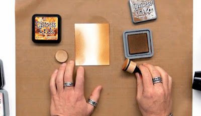 Σε σκούρο φόντο, είτε είναι χαρτί kraft είτε μαύρο cardstock τα πράγματα αλλάζουν. Θα παρατηρήσετε ότι εδώ τα distress oxides καλύπτουν πολύ καλύτερα το σκούρο φόντο απο ότι τα distress inks...