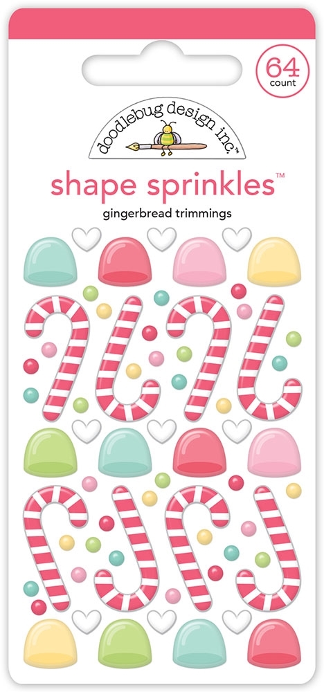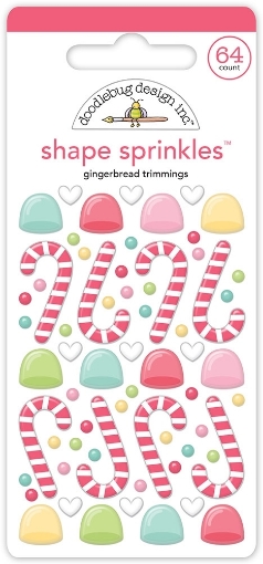 👉 Η συσκευασία περιέχει 64 αυτοκόλλητα shape sprinkles. Εικόνες με χριστουγεννιάτικα μπαστουνάκια καραμέλας, καρδούλες και ζαχαρωτά.