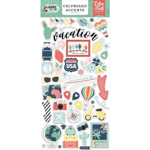 25 διακοσμητικά chipboard από τη συλλογή Away We Go της Echo Park. Εικόνες με υδρόγειους, λουλούδια, αερόστατα, quotes και άλλα