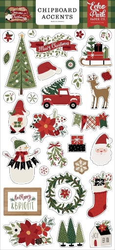 Η συσκευασία περιέχει 32 διακοσμητικά chipboard με χιονάνθρωπους, χριστουγεννιάτικες κάλτσες, στεφάνια, ταράνδους και άλλα χριστουγεννιάτικα στολίδια.