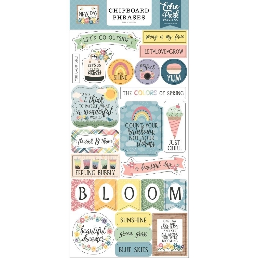 25 αυτοκόλλητα chipboard με φράσεις από τη συλλογή New Day της Echo Park.