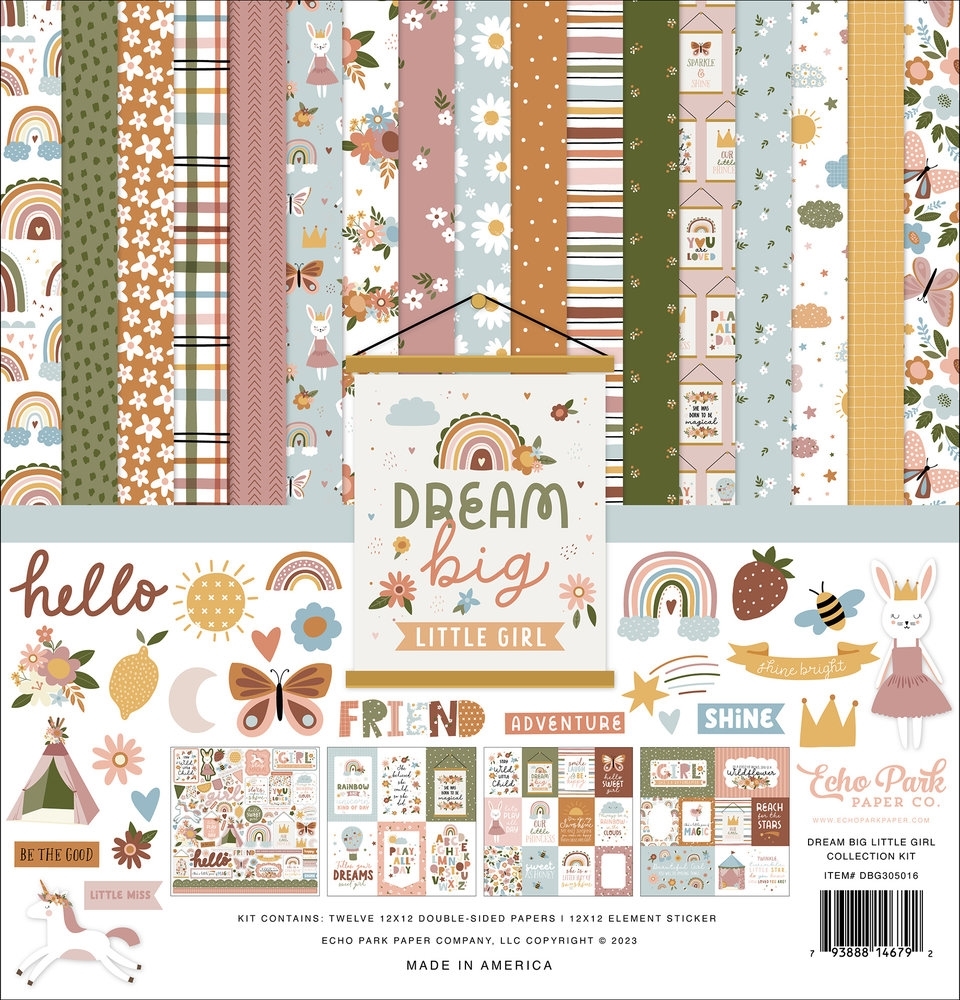 Η συλλογή Dream Big Little Girl της Echo Park είναι αφιερωμένη σε όλα εκείνα τα μικρά θηλυκά... τερατάκια που έχουν κλέψει τις καρδιές μας ανεπιστρεπτί! Σε παστέλ αποχρώσεις του ροζ, πολύχρωμα ζωάκια, μωρουδιακά και τρυφερά sentiments συνθέτουν την πιο μοναδική ιστορία για υπέροχα κοριτσάκια!