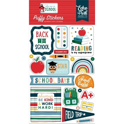 22 puffy αυτοκόλλητα από τη γουστόζικη συλλογή First Day of School της Echo Park. Με quotes και εικόνες που σχετίζονται με το σχολείο όπως βιβλία, μολύβια, μήλα, ψαλίδια, σχολικά σακίδια, παλέτες με νερομπογιές και άλλα πολλά.