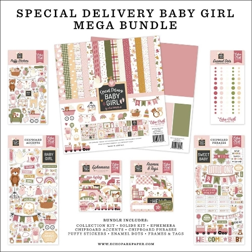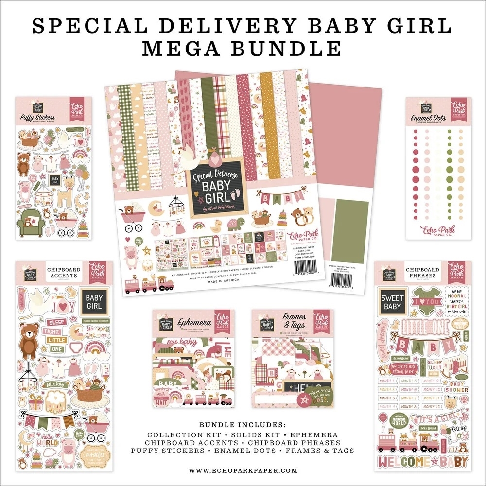 Σετ (Mega Bundle) με διάφορα προϊόντα της συλλογής Special Delivery Baby Girl που έχει σχεδιάσει η Lori Whitlock για την Echo Park.