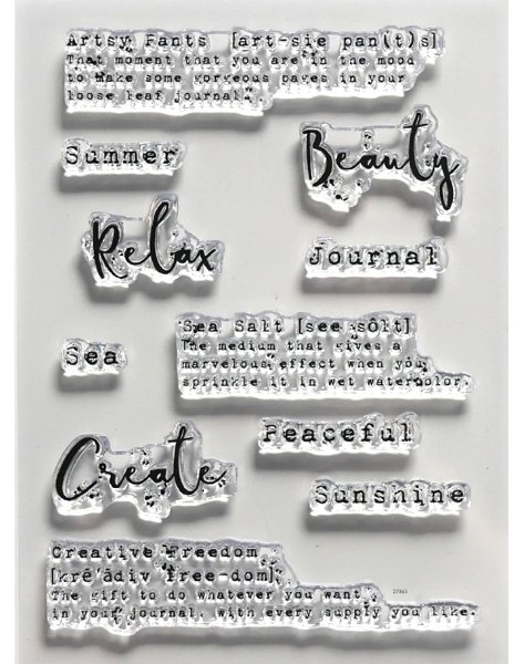 • 11 διάφανες σφραγίδες με λέξεις και φράσεις όπως Summer, Relax, Beauty και άλλα, έτοιμες για χρήση με ακρυλικό μπλοκ.