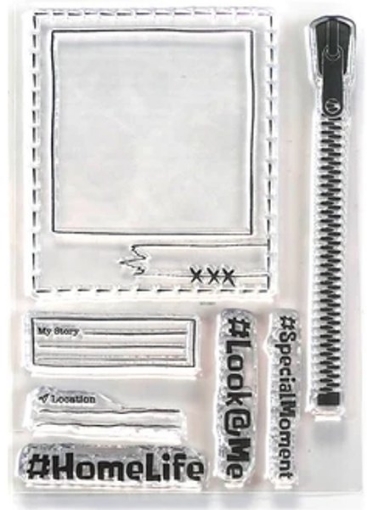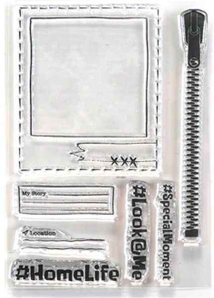 Η συσκευασία περιέχει 7 διάφανες σφραγίδες με πλαίσια για φωτογραφίες και ετικέτες, φερμουάρ και τα hashtags "Look@Me", "HomeLife" και "SpecialMoment", έτοιμες για χρήση με ακρυλικό μπλοκ.