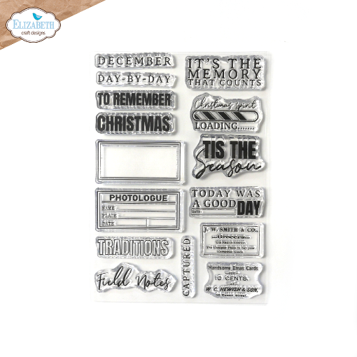 Ένα σετ με 15 διάφανες σφραγίδες από τη συλλογή Field Notes της Elizabeth Craft Designs με εικόνες με tags, πλαίσια και πολλά Χριστουγεννιάτικα sentiments.