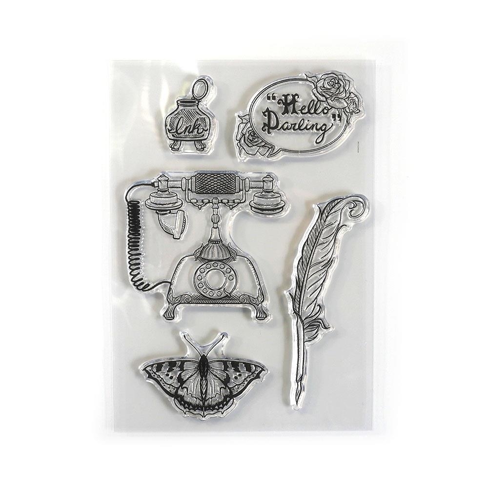 👉 H συσκευασία περιλαμβάνει 5 διάφανες σφραγίδες με ένα vintage τηλέφωνο, ένα μελάνι, μια πεταλούδα, ένα κοντηλογράφο και ένα πλαίσιο.