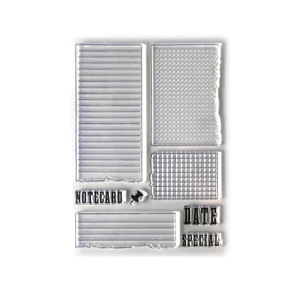 - 8 διάφανες σφραγίδες με πλαίσια για σημειώσεις, λίστες, ένα pin και τις λέξεις notecard, date και special.