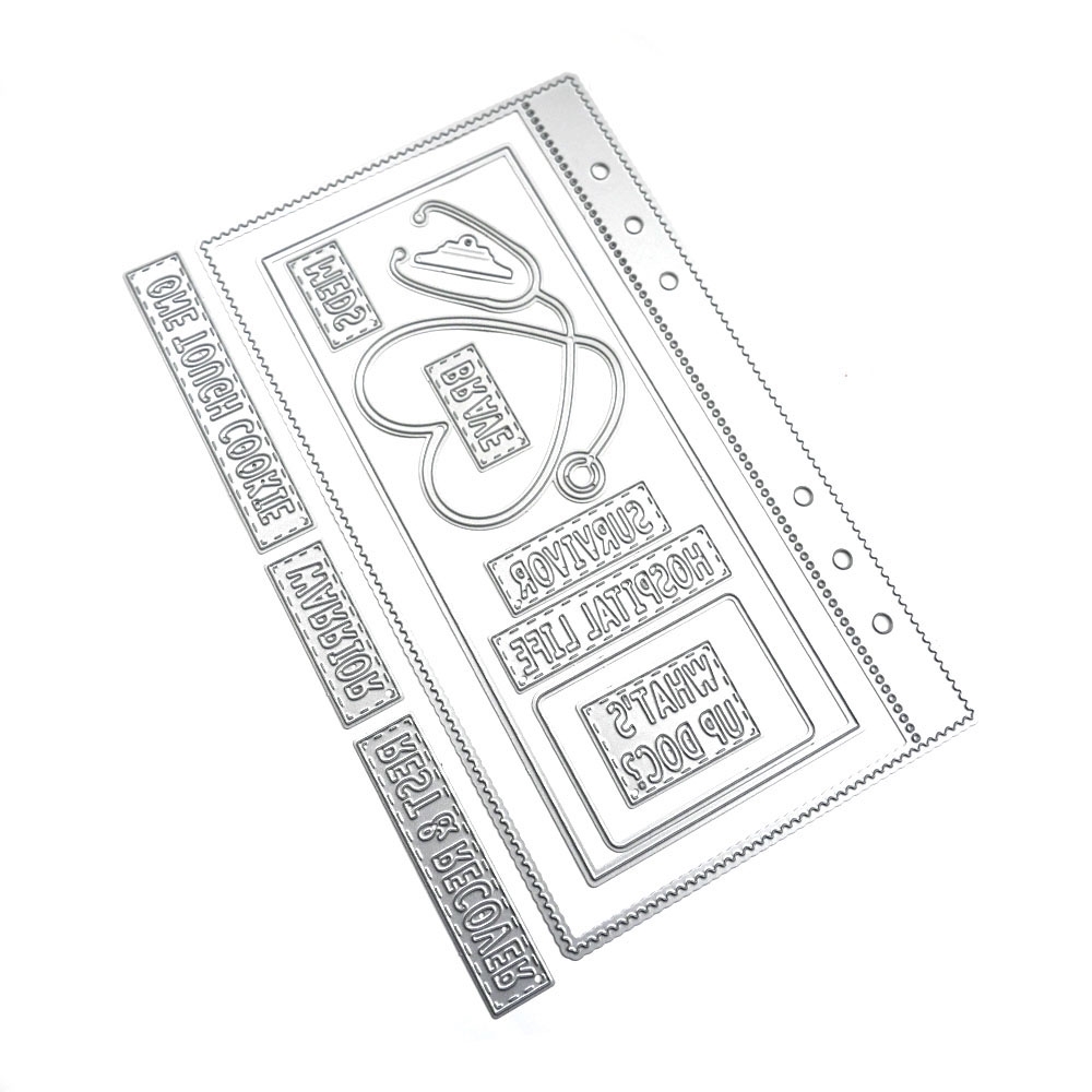 Εικόνες με στηθοσκόπια σε σχήμα καρδιάς, sentiments όπως "brave", "what's up doc", "survivor" και άλλα. Το μεγαλύτερο die έχει τρύπες στο πλάι για να μπαίνει σε planner.