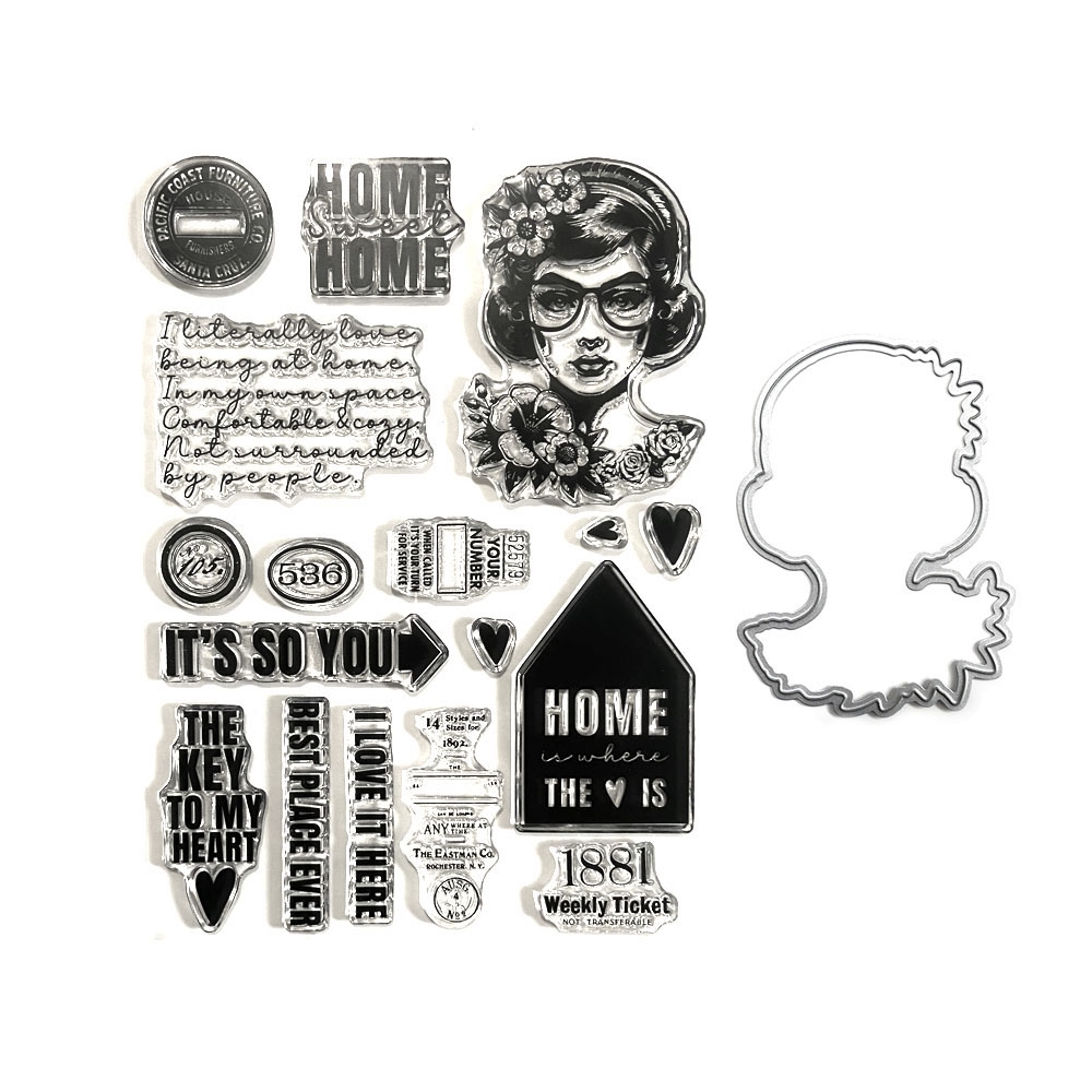 Εικόνες με μια γυναίκα με κορδέλα λουλουδιών και sentiments όπως "it's so you", "home sweet home", "I love it here" και άλλα. Η μήτρα κοπής έχει το περίγραμμα της γυναίκας.