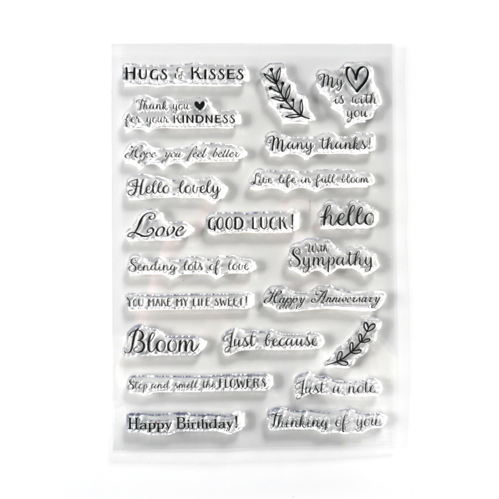 Το σετ είναι ιδιαίτερα χρήσιμο γιατί περιλαμβάνει πολλά διαφορετικά sentiments για πολλές περιστάσεις: από hello, Love, Bloom και Many thanks! μέχρι With Sympathy, Good Luck!, Happy Anniversary, Happy Birthday! και Thinking of you. Μαζί με αυτά, υπάρχουν και μικρά διακοσμητικά στοιχεία, όπως φυλλαράκια και καρδιές, που βοηθούν να δέσει πιο όμορφα η σύνθεση χωρίς να χρειάζεται να ψάχνεις επιπλέον σφραγίδες.