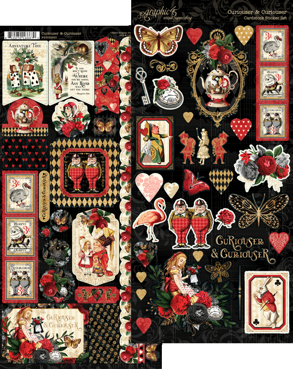 Η Graphic 45 έχει κρυφό άσο στο μανίκι που ακούει στο όνομα Curiouser & Curiouser! Η συλλογή αντλεί έμπνευση από το παραμύθι της Αλίκης στη Χώρα των Θαυμάτων και σας προσκαλεί να βουτήξετε στον υπέροχο κόσμο της, εκεί όπου κάθε τι άσχετο γίνεται σχετικό, εκεί που το αδύνατο γίνεται δυνατό! Η συλλογή κινείται στις αποχρώσεις του κόκκινου, του πράσινου και του μαύρου.