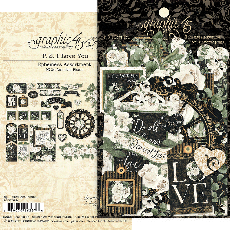 Η συλλογή P.S. I Love You της Graphic 45 υπογραμμίζει για μία ακόμη φορά πόσο όμορφο είναι να σου λένε "σ'αγαπώ"! Σε ένα κομψό μαύρο σκηνικό με απαλά ιβουάρ τριαντάφυλλα και πλαισιωμένη με sentiments… ραντισμένα με αγάπη, η συλλογή είναι ιδανική για να φτιάξετε ρομαντικά άλμπουμ για την επέτειό σας, κάρτες για γάμο ή απλά scrapbooking έργα για να δείξετε στους αγαπημένους σας πόσο σημαντικοί είναι για σας!