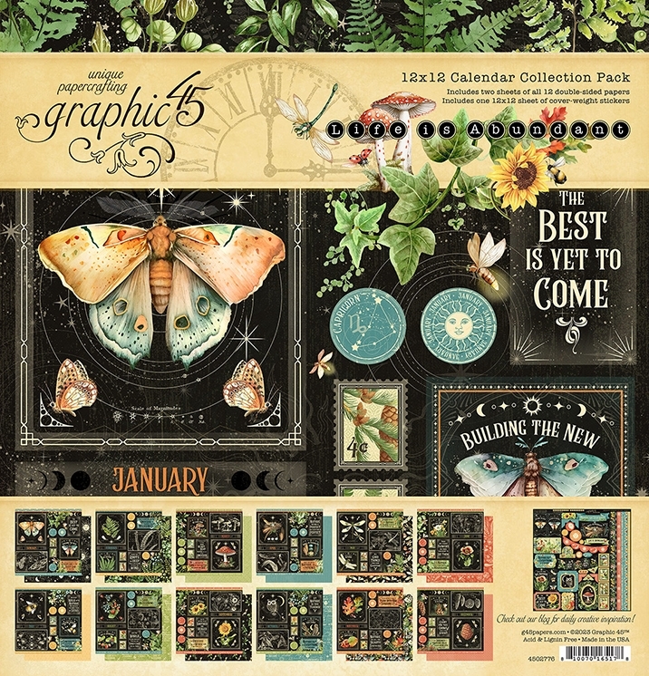 Η συλλογή Life is Abundant της Graphic 45 σας προσκαλεί σε μια μυστικιστική ιστορία που συνδυάζει μοναδικά την απόκοσμη γοητεία του δάσους με τη σκοτεινή αίγλη ενός σεληνικού ημερολογίου! Μανιτάρια, κουκουβάγιες, σκαθάρια, λουλούδια, φυτά και νυχτοπεταλούδες σε έντονα χρώματα, περιτριγυρισμένα από λευκά ουράνια σύμβολα και ζώδια κινούνται αρμονικά σε μαύρο φόντο και πλαισιώνουν τους 12 μήνες του χρόνου σκορπίζοντας κοσμική μαγεία στα έργα σας! Η συλλογή γίνεται το κρυφό διαμαντάκι - πηγή ατελείωτης έμπνευσης για όλους τους paper crafters, card makers, mixed media artists και scrapbookers!
