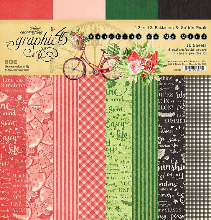 Μύρισε… καλοκαίρι με τη συλλογή Sunshine on My Mind της Graphic 45! Λαχταριστά καρπούζια και vintage κόκκινα ποδήλατα συνθέτουν ένα ξέγνοιαστο σκηνικό γεμάτο καλοκαιρινά vibes και όμορφους περιπάτους στη φύση. Η συλλογή κινείται στις αποχρώσεις του κόκκινου, του ροζ, του πράσινου και του μαύρου και είναι ιδανική για να αιχμαλωτίσετε στα έργα σας την ανεμελιά του καλοκαιριού που τόσο αγαπάμε.