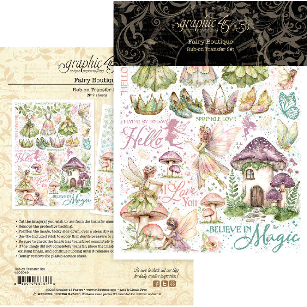 Κάντε μια βόλτα σε έναν κόσμο μαγικό με τη συλλογή Fairy Boutique της Graphic 45! Ντελικάτες νεράιδες στροβιλίζονται ανάμεσα σε όμορφα μανιτάρια και μοσχομυριστά λουλούδια, σκορπίζοντας αστερόσκονη στις αποχρώσεις του μωβ και του πράσινου!