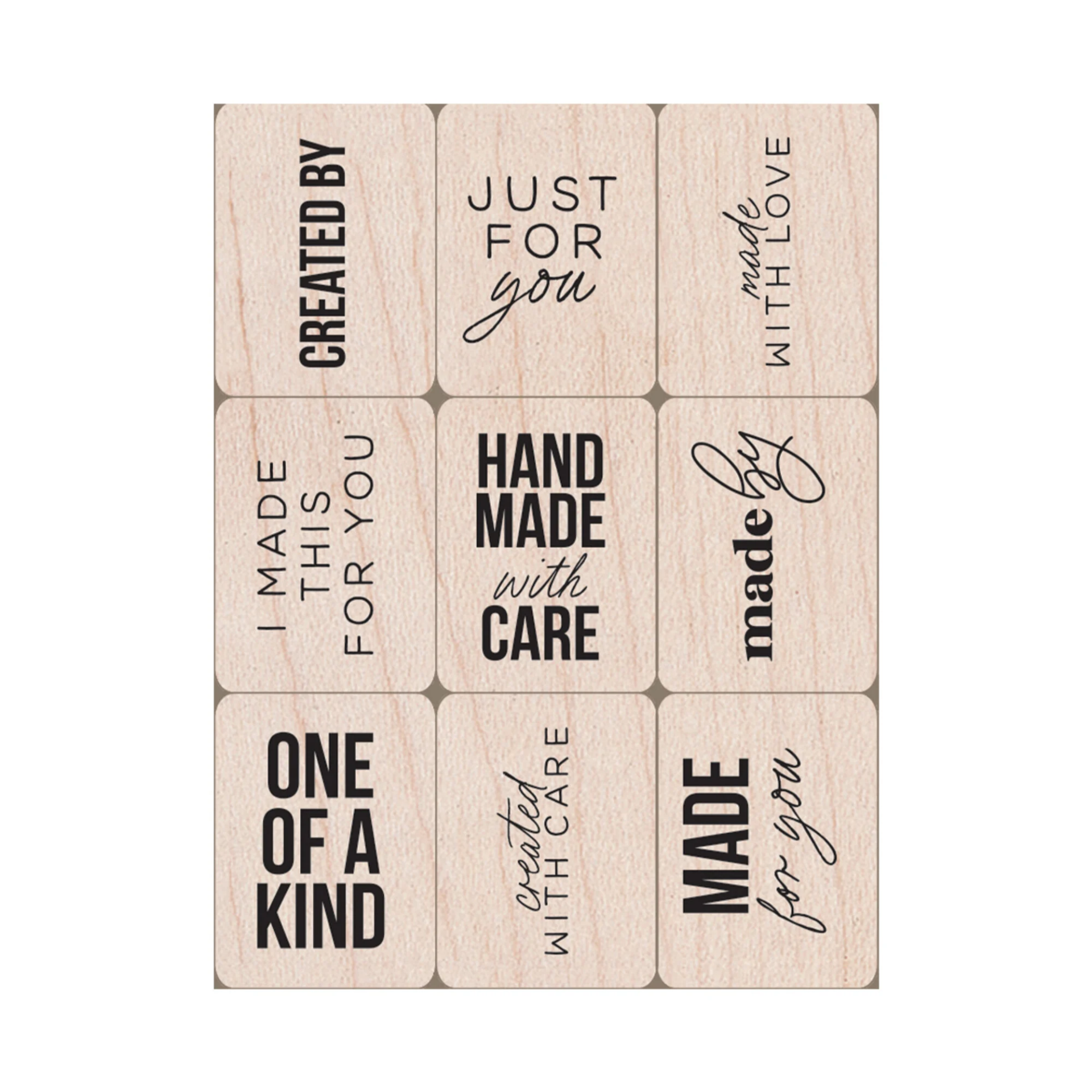 Το Hero Arts Handmade Mini Tub είναι ένα σετ από 9 ξύλινες σφραγίδες με φράσεις αφιερωμένες στη χειροποίητη δημιουργία. Ιδανικό για να υπογράφεις, να επισημαίνεις και να δίνεις προσωπικό χαρακτήρα στα handmade έργα, τις συσκευασίες και τα δώρα σου.