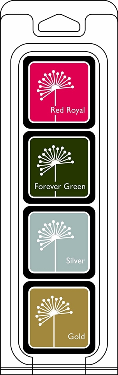 Η συσκευασία περιλαμβάνει 4 mini ink pads σε διαφορετικά χρώματα: Red Royal, Forever Green, Silver, Gold.