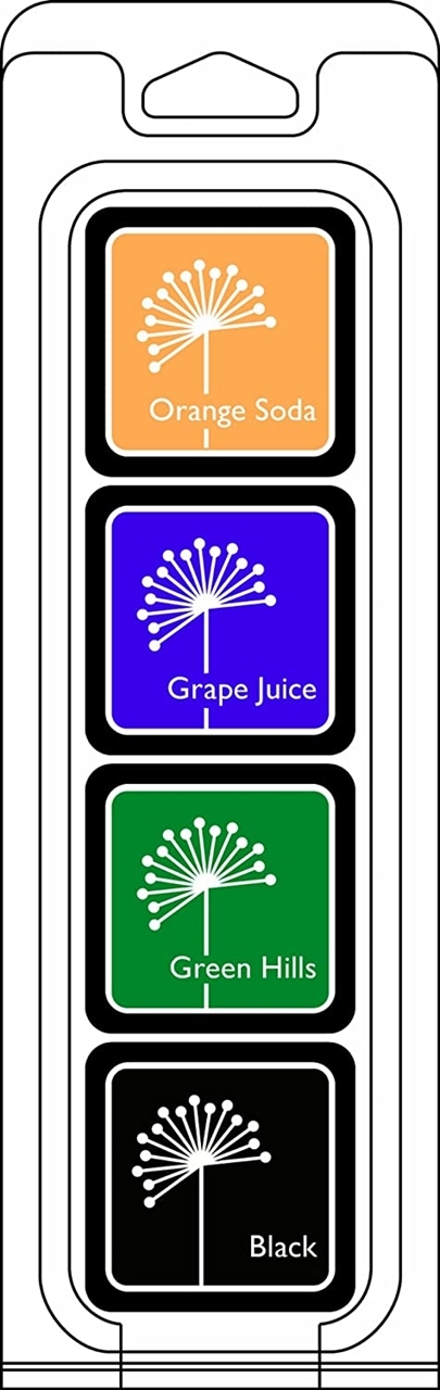 Έχουν βάση το νερό, είναι acid free και archival και δεν ξεθωριάζουν. Η συσκευασία περιλαμβάνει 4 mini ink pads σε διαφορετικά χρώματα: Orange Soda, Grape Juice, Green Hills και Black.