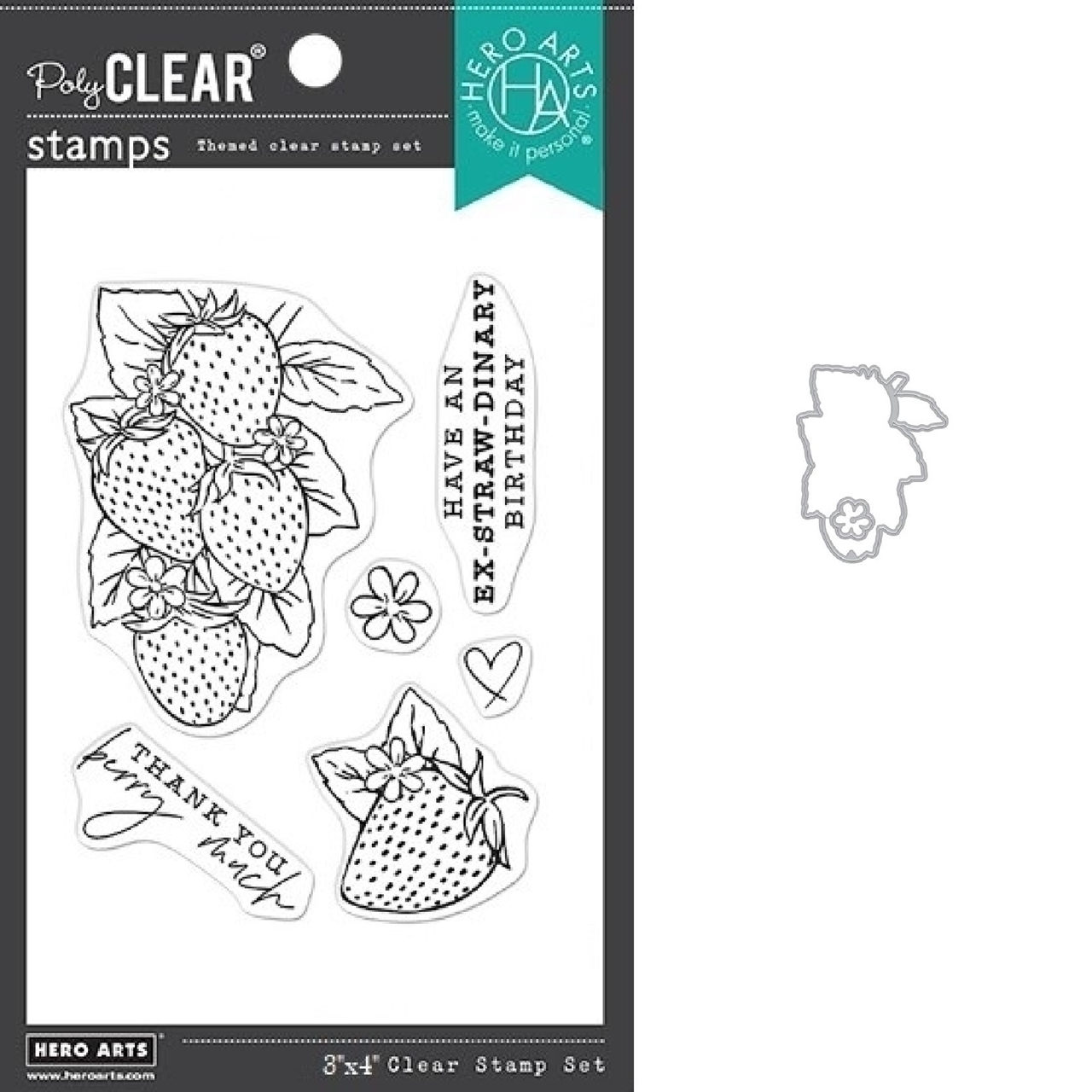 • Hero Arts Clear Stamps - Strawberries:  6 διάφανες σφραγίδες σε καρτέλα 3'' x 4'', έτοιμες για χρήση με ακρυλικά μπλοκ. Οι σφραγίδες περιλαμβάνουν φράουλες, λουλούδια και καρδούλες και τις φράσεις THANK YOU berry much", και "HAVE AN EX-STRAW-DINARY BIRTHDAY”.