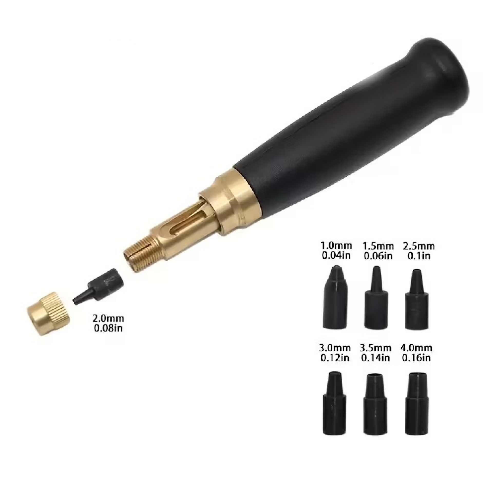 Η ξύλινη εργονομική λαβή προσφέρει άνετο κράτημα και φυσική αίσθηση, ενώ το μπρούτζινο στέλεχος εξασφαλίζει σταθερότητα και αντοχή στον χρόνο. Οι 6 αποσπώμενες μύτες καλύπτουν από λεπτή βιβλιοδεσία μέχρι πιο απαιτητικές χειροτεχνίες.