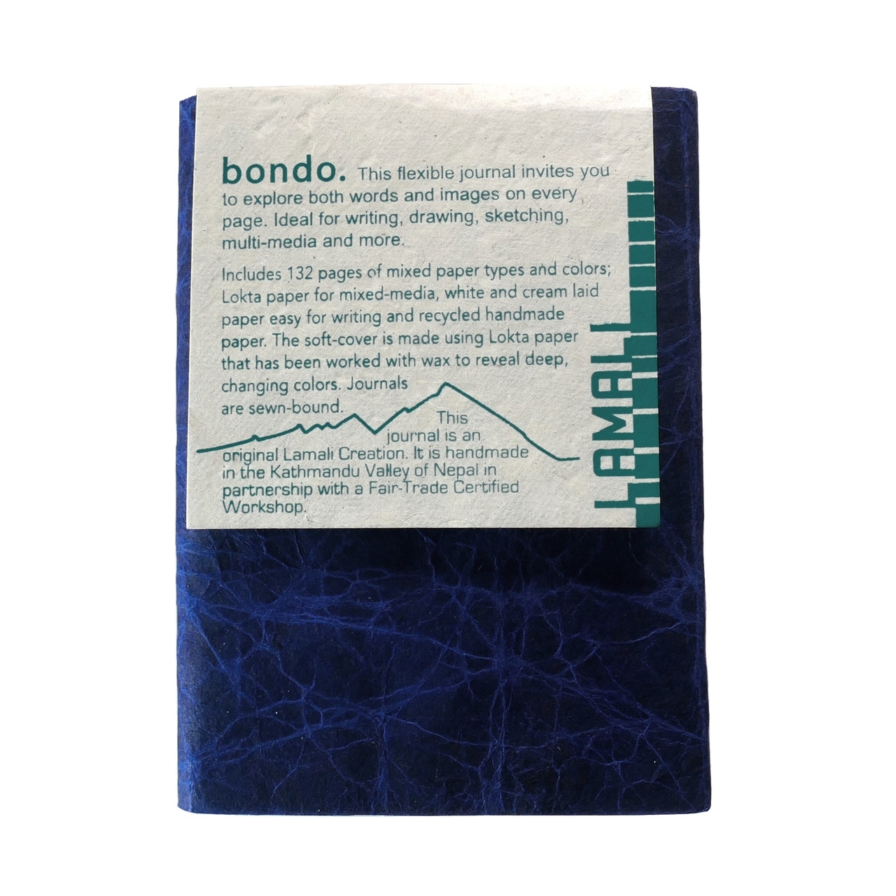Χειροποίητα σημειωματάρια από την Lamali, με διάφορα χαρτιά κατάλληλα για σχέδιο, γραφή και mixed media! Το μαλακό εξώφυλλο των Bondo Journals, είναι φτιαγμένο από χειροποίητο χαρτί Lokta στο οποίο έχει γίνει ειδική επεξεργασία με κερί για να αδιαβροχοποιηθεί και να αναδειχθούν τα εντυπωσιακά, βαθιά του χρώματα. Το journal έχει 132 σελίδες από διαφορετικά χαρτιά, που θα αποτελέσουν έμπνευση για διάφορες τεχνικές δημιουργίας