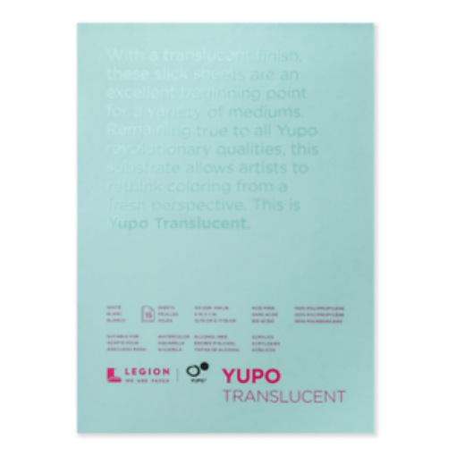 Το χαρτί Yupo, είναι η καινούργια τεχνολογία στο χαρτί. Είναι συνθετικό χαρτί 104lb (154 gsm), φτιαγμένο από 100% polypropylene. Είναι αδιάβροχο και πολύ δυνατό. Μένει εντελώς επίπεδο ό,τι medium και να του βάλετε επάνω.