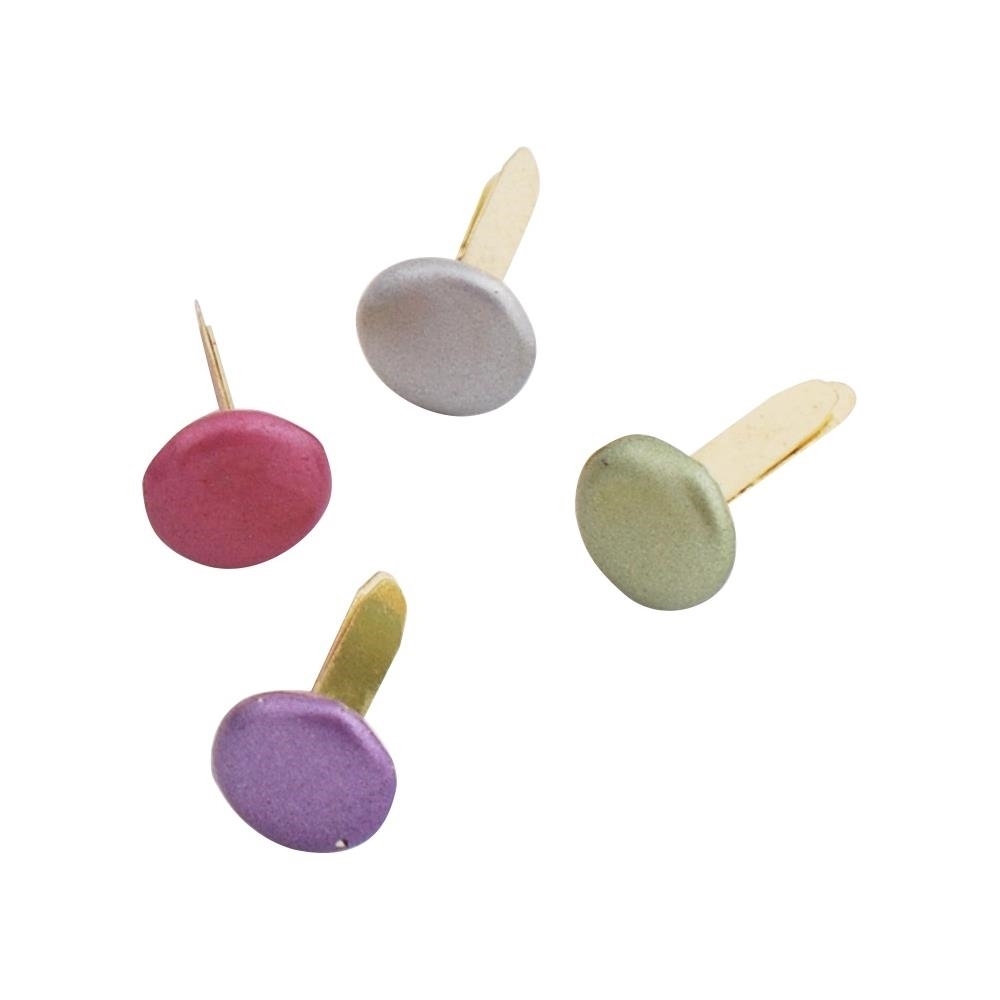 Η συσκευασία περιλαμβάνει 50 στρογγυλά μεταλλικά brads σε 4 χρώματα (ροζ, μωβ, ασημί και λαδί).