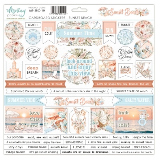 56 αυτοκόλλητα chipboard από τη συλλογή Sunset Beach της Mintay Papers με εικόνες από λουλούδια, κάστρα στην άμμο, ξαπλώστρες, παγωτά, quotes και άλλα.