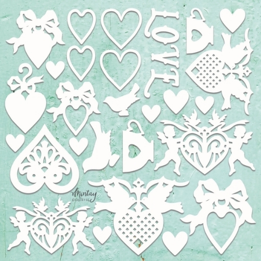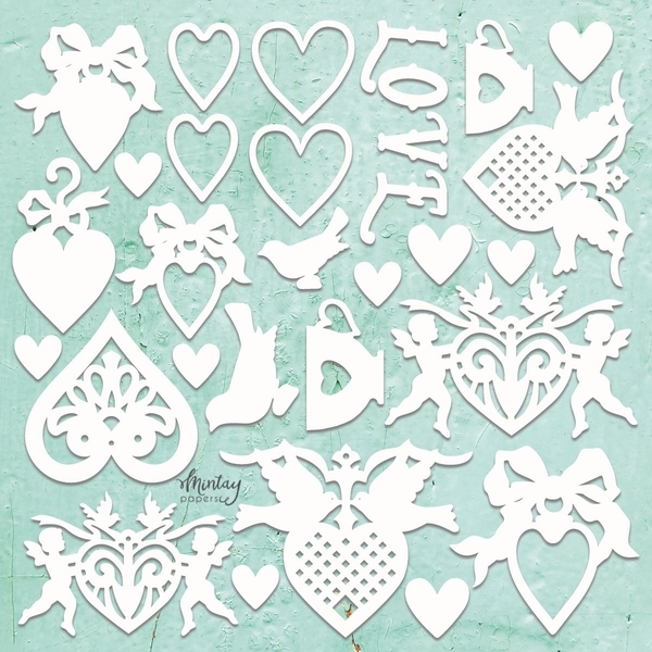 28 διακοσμητικά από ελαφρύ chipboard σε λευκό χρώμα και με εικόνες από καρδούλες, περιστέρια και άλλα.