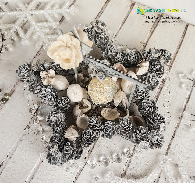Στη μέση του αστεριού, πρόσθεσα ένα ξύλινο διακοσμητικό, το οποίο επίσης χρωμάτισα ασημί. Πρόσθεσα μερικά λουλούδια και διάφανα πετράδια πάνω του και γέμισα κάποια κενά σημεία με αποξηραμένα πέταλα και καρπούς, που έβαψα λευκούς.