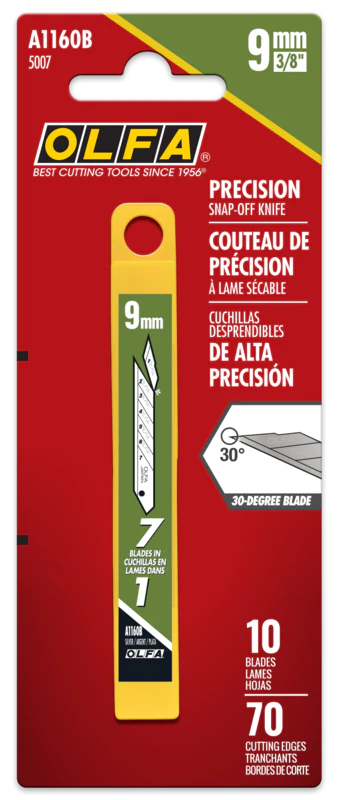 Οι ανταλλακτικές λεπίδες OLFA 9mm αποτελούν το ιδανικό συμπλήρωμα για το Stainless Steel Precision Snap-Off Knife της OLFA. Κατασκευασμένες από υψηλής ποιότητας carbon steel, προσφέρουν εξαιρετική αντοχή, ακρίβεια και σταθερότητα σε κάθε κοπή.