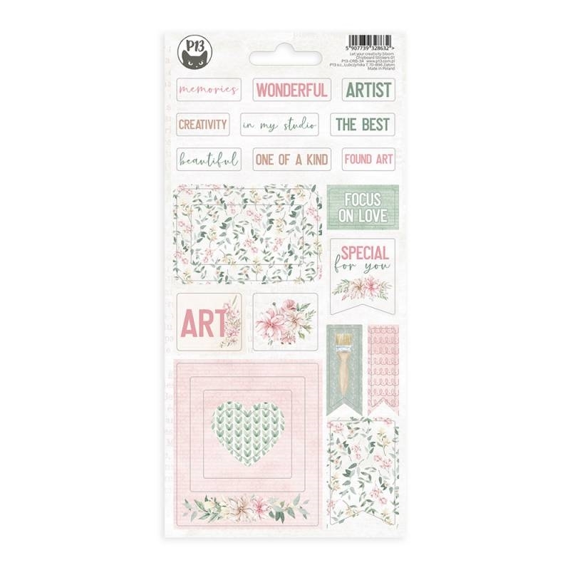 Αυτοκόλλητα chipboard από τη συλλογή Let Your Creativity Bloom της P13. Η φαντασία και η δημιουργικότητα μπορούν να αλλάξουν ολόκληρο τον κόσμο! Οτιδήποτε μπορείτε να φανταστείτε είναι πραγματικό! Αδράξτε την ευκαιρία και δημιουργήστε!