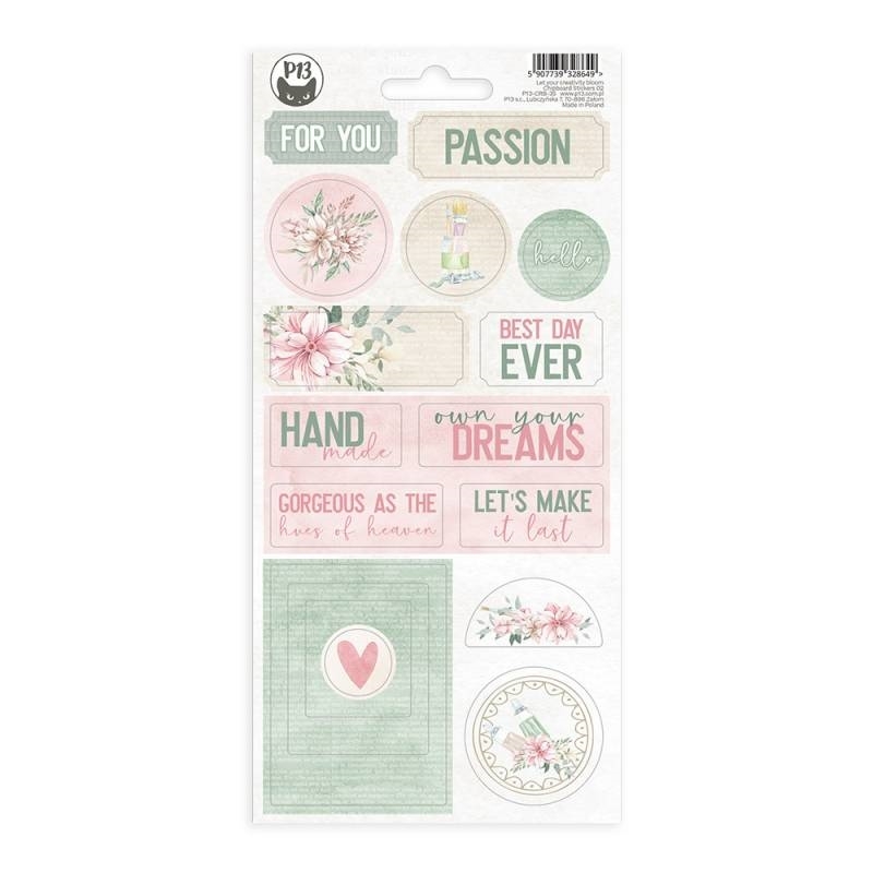 Αυτοκόλλητα chipboard από τη συλλογή Let Your Creativity Bloom της P13. Η φαντασία και η δημιουργικότητα μπορούν να αλλάξουν ολόκληρο τον κόσμο! Οτιδήποτε μπορείτε να φανταστείτε είναι πραγματικό! Αδράξτε την ευκαιρία και δημιουργήστε!
