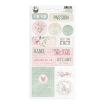 14 αυτοκόλλητα chipboard με quotes και εικόνες από λουλούδια, καρδούλες και άλλα σε καρτέλα 4” x 9” (10.5 x 23 cm)