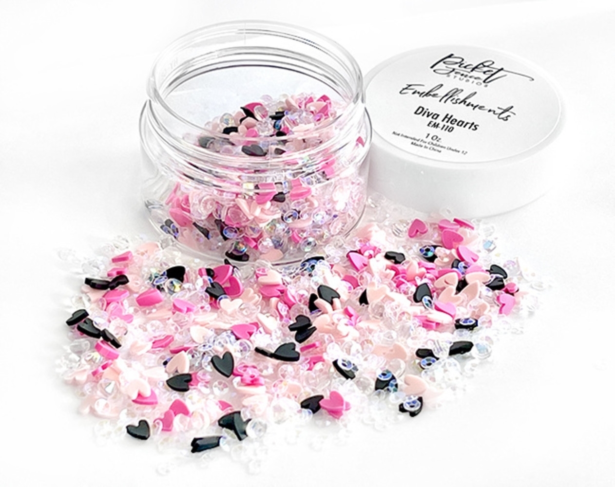 👉 Η συσκευασία περιέχει μίγμα 28 gr (1oz) με σκούρες ροζ, ανοιχτές ροζ και μαύρες καρδούλες από πηλό μαζί με διάφανα ιριδίζοντα sequins και διαμαντάκια.