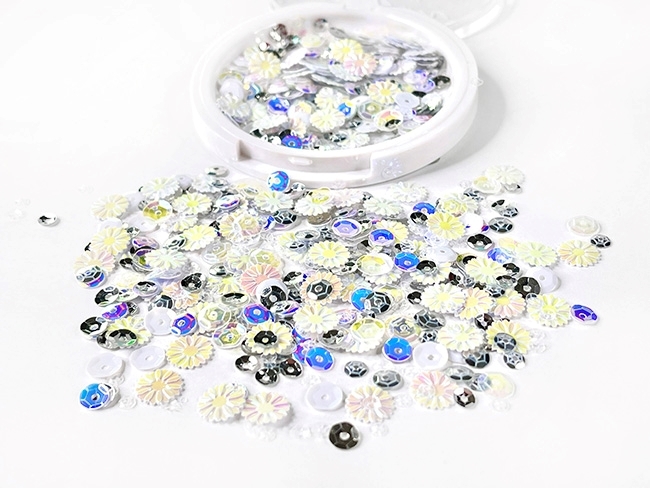 Μέσα στο βαζάκι των 1 oz θα βρεις ένα mix από λευκές πούλιες σε σχήμα μικρού λουλουδιού “bottlecap”, περλίτσες και ιριδίζοντα στοιχεία που αντανακλούν το φως απαλά, δημιουργώντας ένα φίνο, γυαλιστερό εφέ.