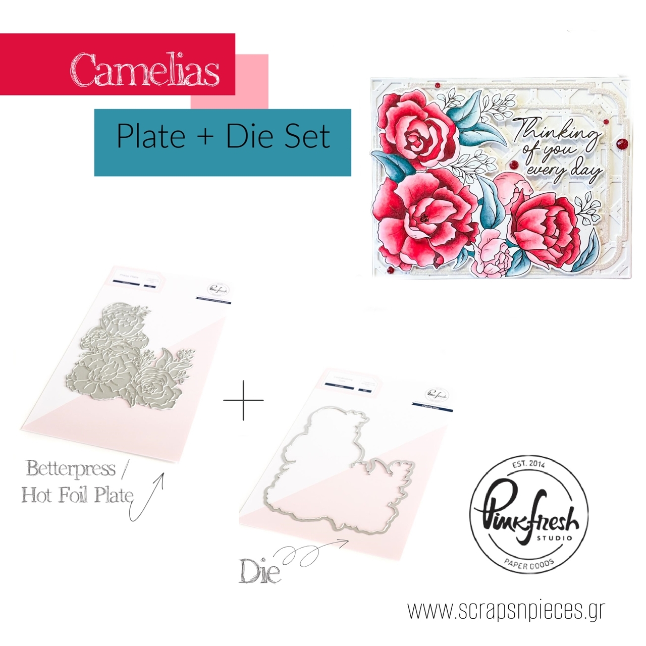 Σετ με Press plate και μήτρα κοπής με όμορφες καμέλιες σε σχέδια της Emily Midgett για την Pinkfresh Studio. Δώστε στα έργα σας vintage άρωμα με εφέ τυπογραφείου, εύκολα και χωρίς καθόλου μουντζούρα! Η μήτρα κόβει το περίγραμμα του σχεδίου και συμπληρώνει ιδανικά το σετ. Χρησιμοποιήστε τις μήτρες για να δημιουργήσετε επίπεδα, να δώσετε βάθος, και να κάνετε τα σχέδια των σφραγίδων να "ξεπηδούν" κυριολεκτικά μέσα από τα έργα σας!